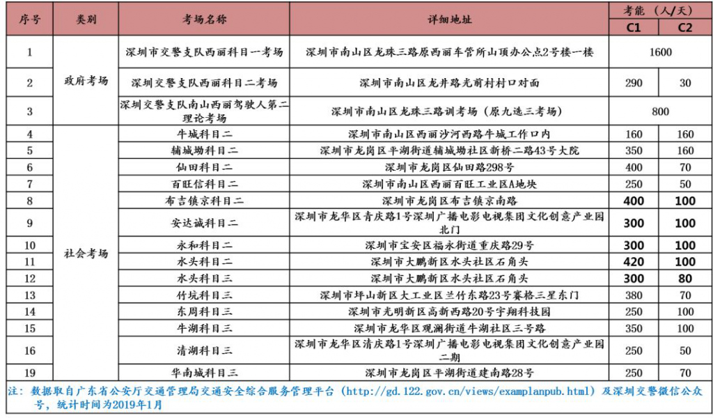 深圳市現(xiàn)有科目一考場(chǎng)1處,科目二考場(chǎng)9處,科目三考場(chǎng)6處,安全文明考場(chǎng)1處,考場(chǎng)具體情況如下: