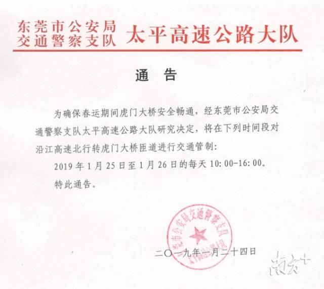為確保春運(yùn)期間虎門大橋安全暢通,經(jīng)東莞市公安局交通警察支隊(duì)太平高速公路大隊(duì)研究決定,2019年1月25日至1月26日的每天10:00-16:00,對(duì)沿江高速北行轉(zhuǎn)虎門大橋匝道進(jìn)行交通管制。
