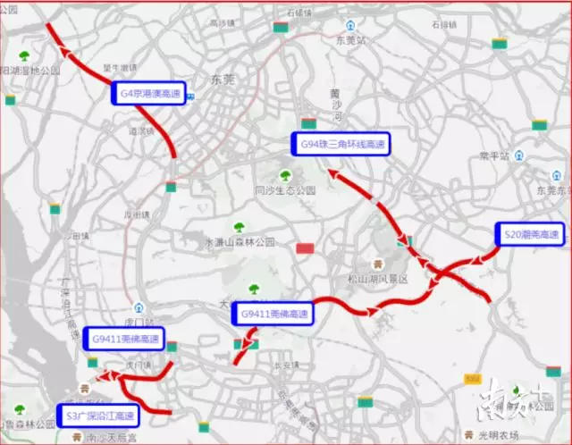 (2)建議行駛在廣深高速公路由深圳往虎門方向的車輛,在長安出口、虎門出口繞行國道或轉(zhuǎn)到?;⒏咚俟非巴綇V州等地。