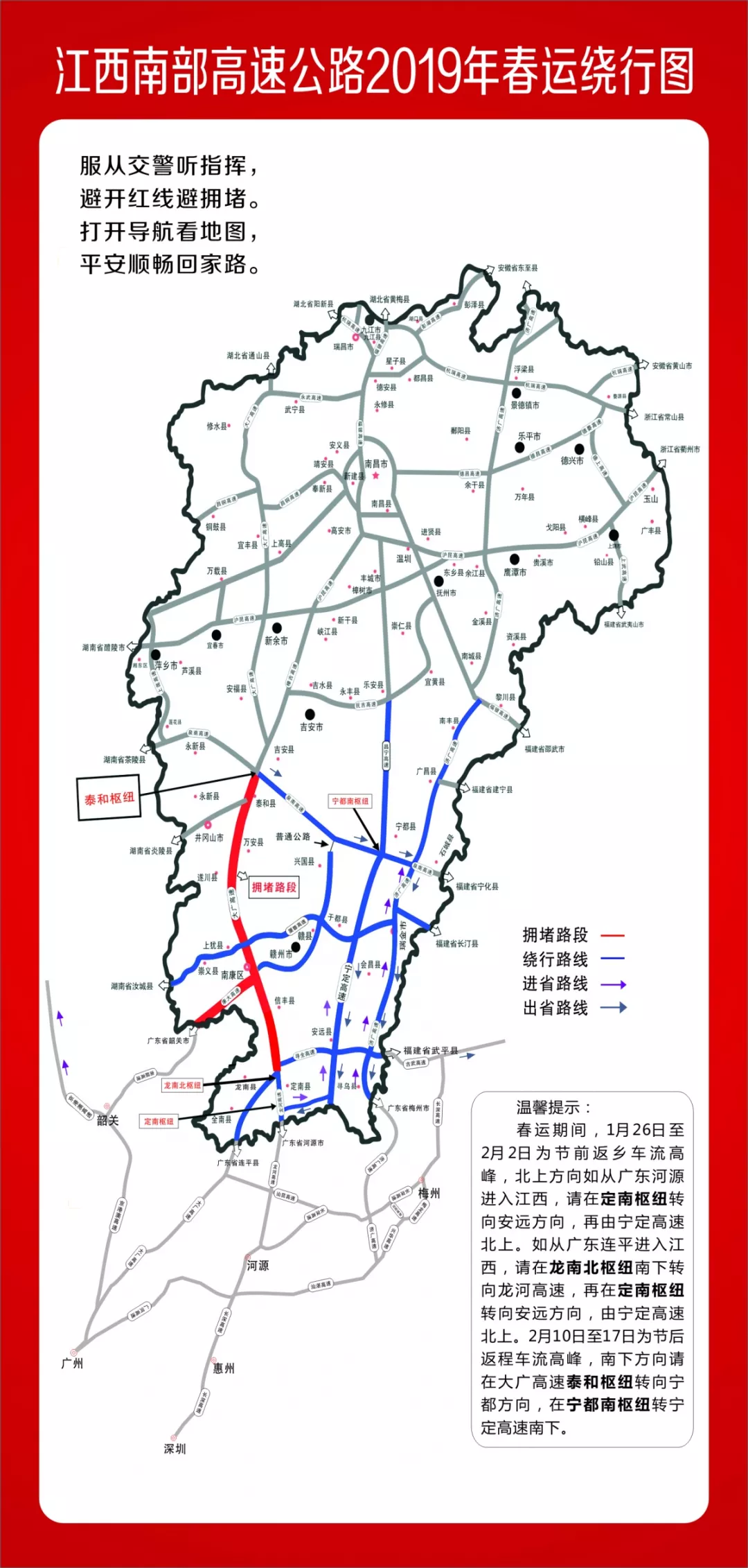 由長深高速北上,在廣東河源市境內(nèi)轉(zhuǎn)龍河高速進(jìn)入江西,后由定南樞紐轉(zhuǎn)寧定高速聯(lián)絡(luò)線(S86),38公里后再由寧定高速北上,以避開大廣高速擁堵路段。