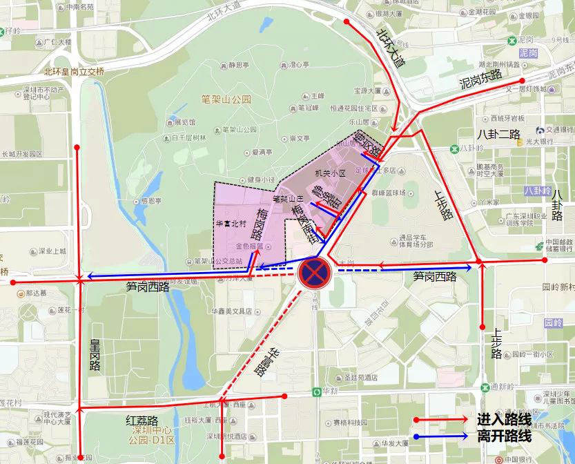 車行交通調(diào)整為:筍崗西路 -梅崗路;紅荔路 -皇崗路 -筍崗西路 -梅崗路;筍崗西路 -泥崗西路 -靜逸街(梅崗南街)。