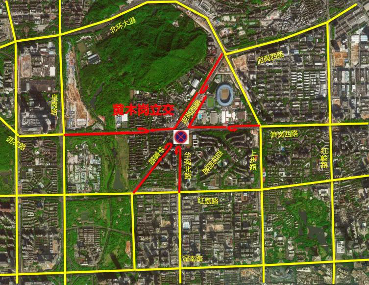 原經(jīng)黃木崗立交節(jié)點(diǎn)的交通需從北環(huán)大道、紅荔路、深南大道、彩田路、皇崗路、上步路、紅嶺路等外圍道路繞行。