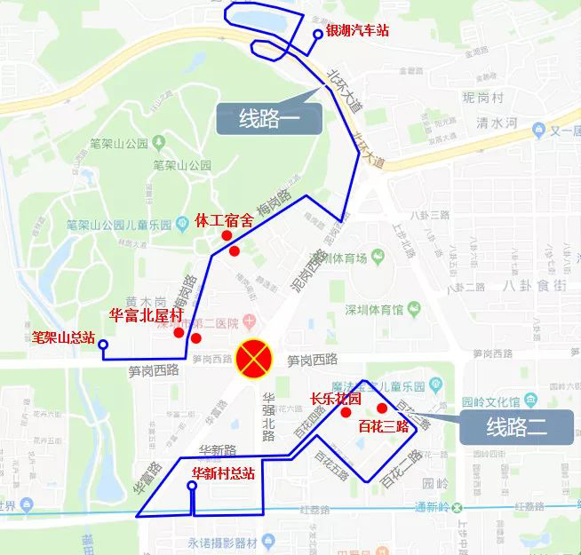 封閉施工期間,途經(jīng)泥崗西路、筍崗西路、華富路、華強(qiáng)北路的54條公交線路、高峰專線、高快巴士臨時(shí)改道繞行。