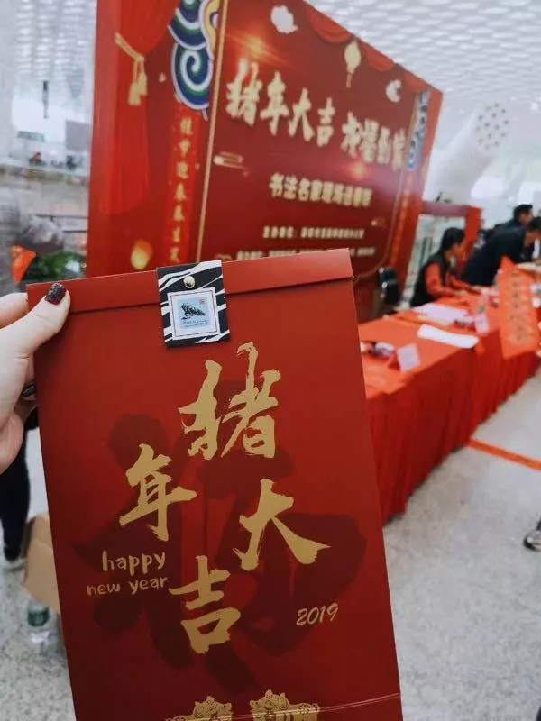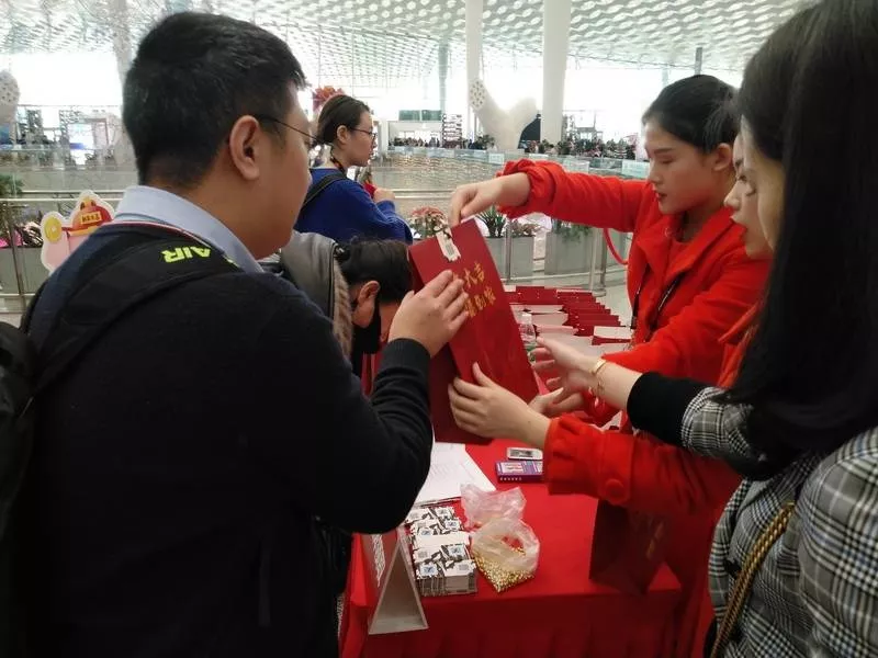 喜慶的紙袋給旅客們裝春聯(lián),