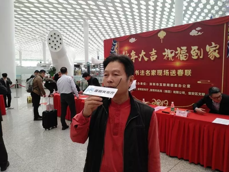 寶安區(qū)書法家協(xié)會主席李高揚介紹,在機場送春聯(lián)很有意義,可以給全國各地的朋友們送上新年祝福。這次深圳發(fā)布廳攜手深圳機場舉辦活動,寶安區(qū)書法家協(xié)會集結高手出動為群眾服務,為市民送去祝福。他祝大家新春快樂,闔家幸福。