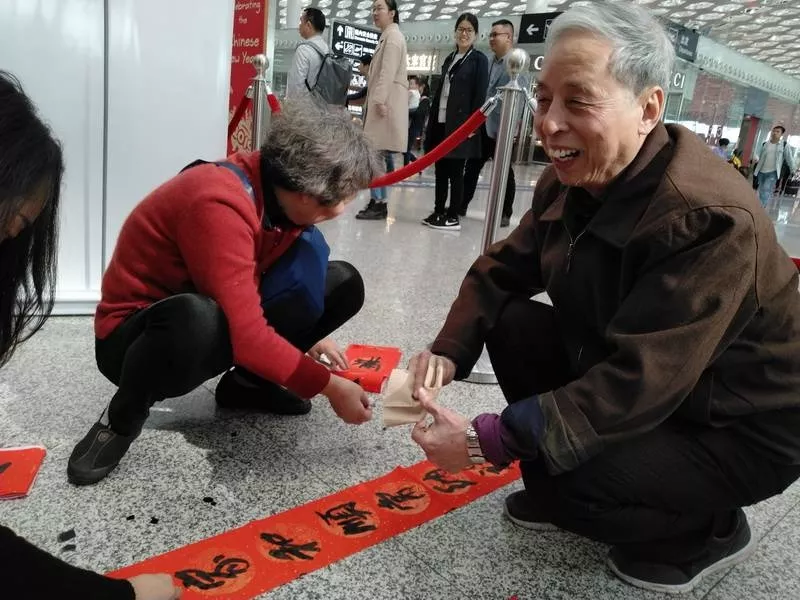 來領春聯(lián)的旅客里有國內輾轉回老家的,有回國過年的,也有特地去國外過年的。來自江西婺源的曾老先生11點多的飛機飛往馬來西亞,今年他和老伴、孩子將在馬來西亞過年。他選的這兩幅春聯(lián)是他對新年的希望與祝福,將帶到馬來西亞貼起來,給新年增添年味兒?!拔疫€可以送給朋友,這是最好的禮物,他們一定會喜歡的。”曾先生高興地說。