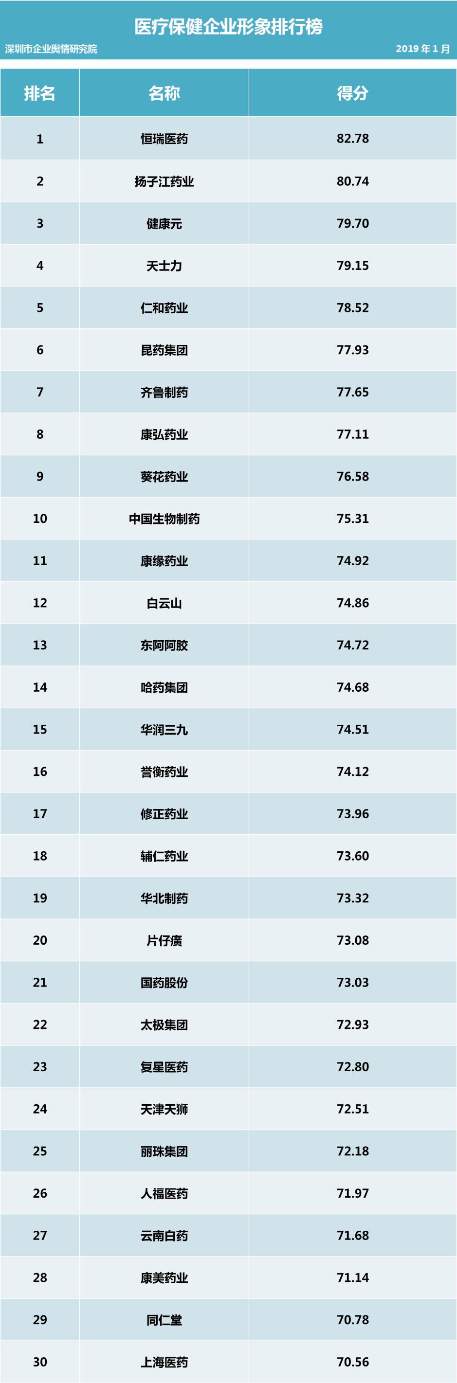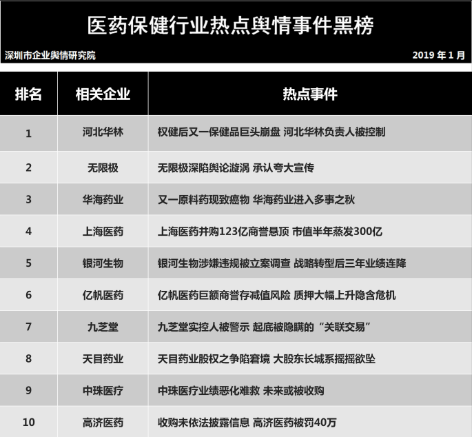 深圳新聞網(wǎng)2019年1月31日訊 (記者田志強(qiáng) 通訊員陳文光)1月31日,深圳企業(yè)輿情研究院發(fā)布第十二批企業(yè)輿情榜單。本次榜單重點(diǎn)聚焦房地產(chǎn)及醫(yī)藥保健兩個行業(yè)。醫(yī)藥保健行業(yè)輿情榜單由醫(yī)療保健行業(yè)熱點(diǎn)輿情事件排行榜(紅、黑榜)及醫(yī)藥保健行業(yè)企業(yè)公眾形象排行榜組成。