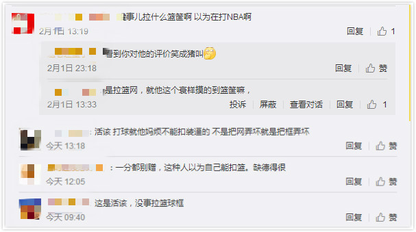 還有一些網友借機表達了自己對某類人的"墻裂"不滿!"沒事兒拉什么球框啊,以為在打 NBA?。ⅲ⒒钤摚蚯蚓蜔┎荒芸圻€裝 X的"......
