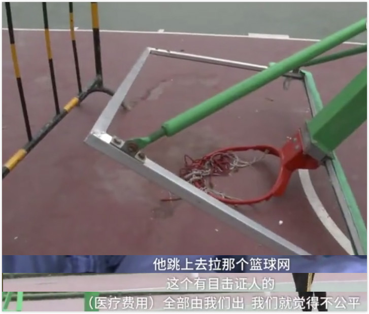何先生認為造成這起事故的主要原因是施工方的疏忽,未將籃球架有效固定,因為倒塌的這個籃球架底座并沒有打鋼釘,填充物也僅有兩塊水泥磚,并不牢固。對此,球場施工方表示,工程驗收時"百分百 OK",愿意出于人道主義關懷給予傷者適當補償,但拒絕支付全部醫(yī)療費,因為"他跳上去拉那個籃球網,有目擊者的"。