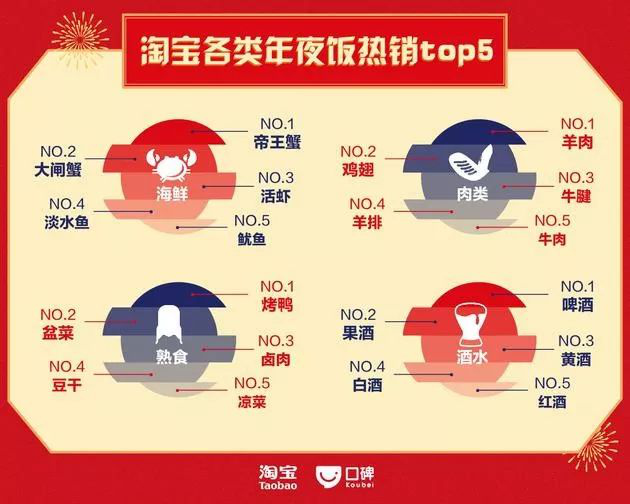 海鮮、肉類、熟食、酒水是消費者最愛在淘寶采購的四類年貨。而啤酒則贏過白酒、黃酒,成為中國人最愛選的年夜飯酒水。