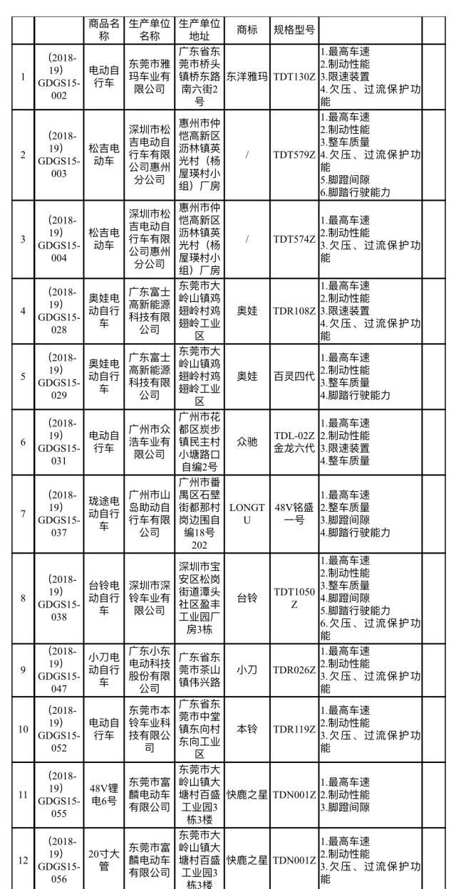 值得注意的是,此次抽檢電動自行車的主要不合格項目有:最高車速、制動性能、限速裝置、欠壓、過流保護(hù)功能、整車質(zhì)量(重量)、腳蹬間隙、腳踏行駛能力等,與消費者的使用安全息息相關(guān)。
