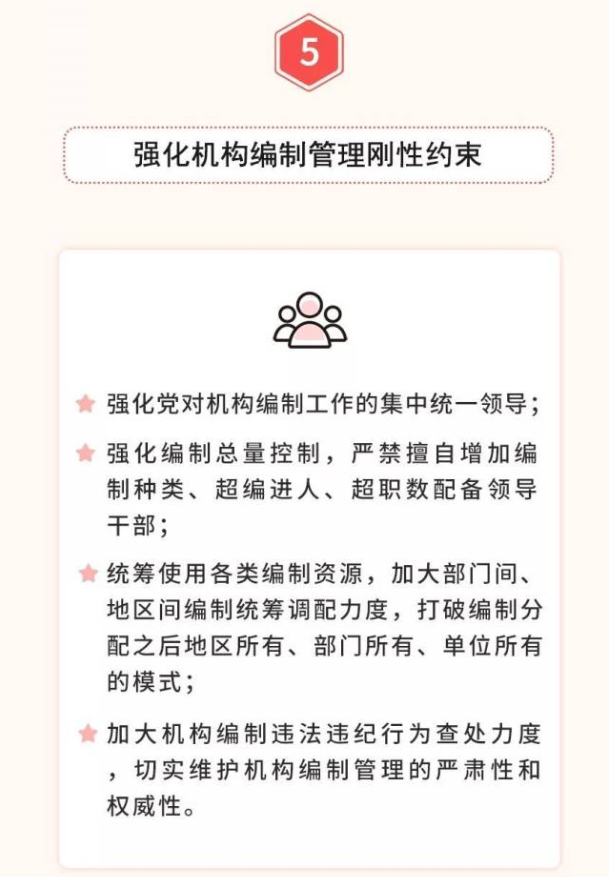 五是全面落實(shí)優(yōu)化協(xié)同高效原則。堅(jiān)持一件事情原則上由一個部門負(fù)責(zé),把理順職責(zé)放在重要位置,從有利于突出主業(yè)、有利于服務(wù)管理的角度出發(fā),實(shí)事求是,科學(xué)設(shè)置黨委和政府機(jī)構(gòu),宜大則大、宜小則小,該加強(qiáng)的加強(qiáng)、該精簡的精簡、該優(yōu)化的優(yōu)化,實(shí)現(xiàn)機(jī)構(gòu)職責(zé)的深度融合。