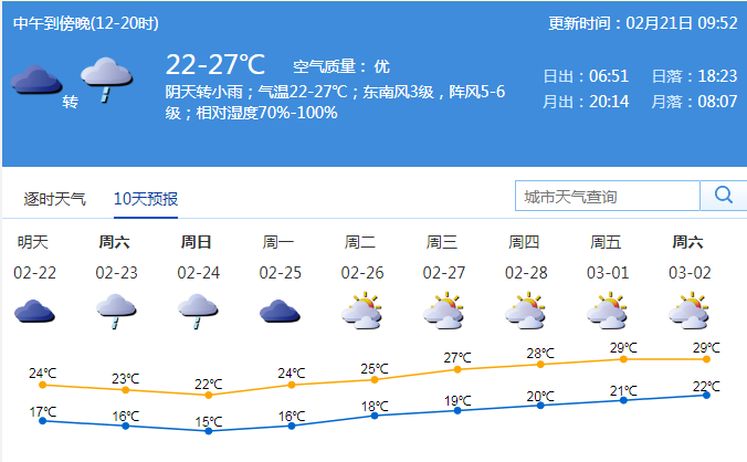 記者從深圳市氣象局了解到,21日深圳市以多云轉(zhuǎn)陰天為主,有分散小雨;氣溫在21-27℃;東南風(fēng)2-3級(jí);相對濕度65%-95%。
