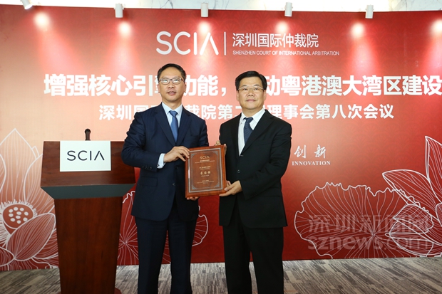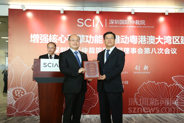 2月21日的發(fā)布會(huì)上,深圳市副市長黃敏為新聘任的兩名深圳國際仲裁院理事袁國強(qiáng)(香港前律政司司長)、劉春華(中聯(lián)辦法律部部長)頒發(fā)了聘書。