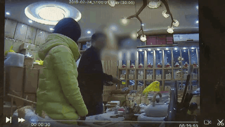 秦女士告訴記者,其實(shí)此時(shí)錢已經(jīng)被掉包了。從監(jiān)控視頻中可以發(fā)現(xiàn),這位顧客在秦女士去冰柜拿茶葉,小娟在檢查第一張100元時(shí),疑似從外套里拿出了一張假幣壓在了錢包底下。