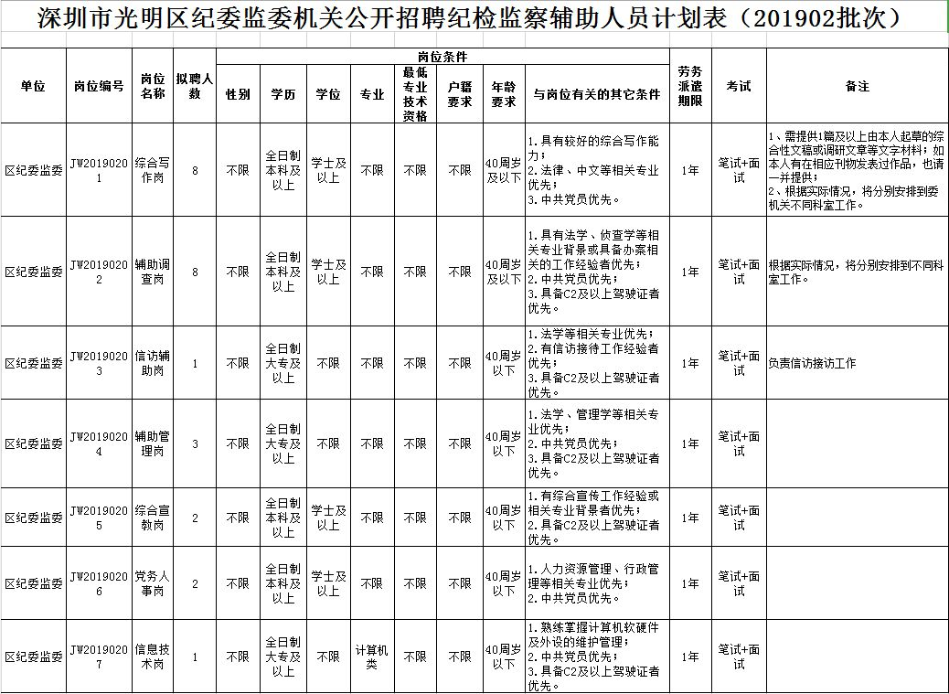 深圳市光明區(qū)紀(jì)委監(jiān)委機(jī)關(guān)公開(kāi)招聘紀(jì)檢監(jiān)察輔助人員計(jì)劃表(201902批次)