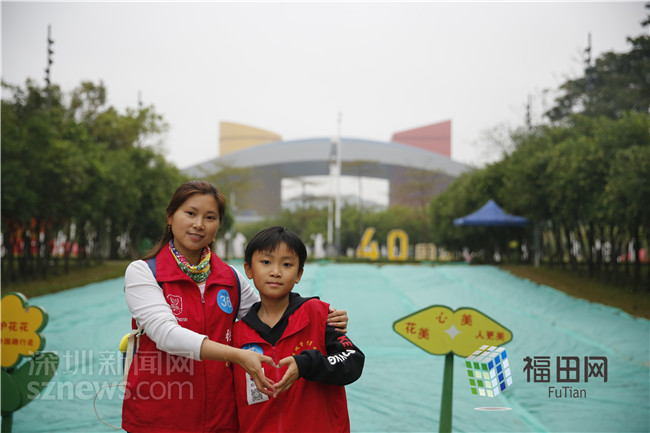 家長志愿者帶著孩子和花田合影。