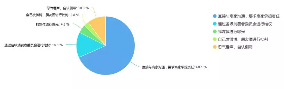 有68.4%的受訪者在遇到消費侵權(quán)后選擇直接與商家溝通,要求商家承擔(dān)責(zé)任,10.4%的受訪者會選擇忍氣吞聲、自認倒霉;其中男性消費者更傾向于找媒體曝光,而女性消費者則傾向于忍氣吞聲。