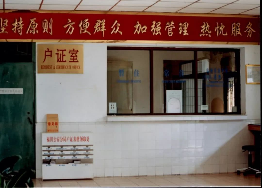 照片中,在水泥門樓的一側掛著一塊政府機關牌匾,白底黑字落有“深圳市公安局福田派出所”幾個大字。門樓上的五星紅旗熠熠生輝,透過門樓,內部有個寬敞的小院,供巡邏車停放及日常操練,再往里走便是一幢3層樓高的辦公樓,辦公樓的中央懸掛一枚警徽,彰顯警隊的莊嚴。一樓是戶政室,一縷陽光透過窗戶灑進來,讓辦事的群眾感到溫暖,也給門欄上“堅持原則 方便群眾加強管理熱忱服務”16個字鍍上了金邊,這是福田派出所對轄區(qū)老百姓的堅定承諾。