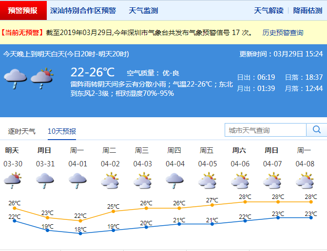 深圳新聞網2019年3月29日訊 記者從深圳氣象局了解到,昨天夜間到今天白天,我市多云,夜間到早晨有輕霧,局地大霧;早晨最低氣溫22-23℃,白天最高氣溫27-28℃;相對濕度70%-100%;南風2-3級;昨天夜間能見度1-5公里。東部局地有大霧能見度在1公里以下,白天能見度轉好達到10-20公里。