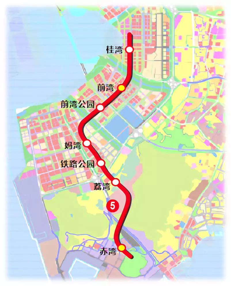 深圳地鐵5號(hào)線南延段,即5號(hào)線二期工程,北起于5號(hào)線前海灣站,經(jīng)前海、南山,終點(diǎn)與地鐵2號(hào)線赤灣站換乘。
