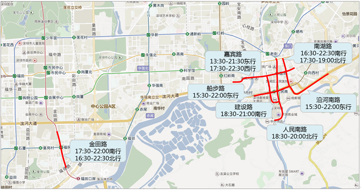 2.梅觀高速公路:20:00-21:30(大坪收費站-觀瀾收費站,北行);18:00-19:00(清湖立交-梅觀路,南行)。
