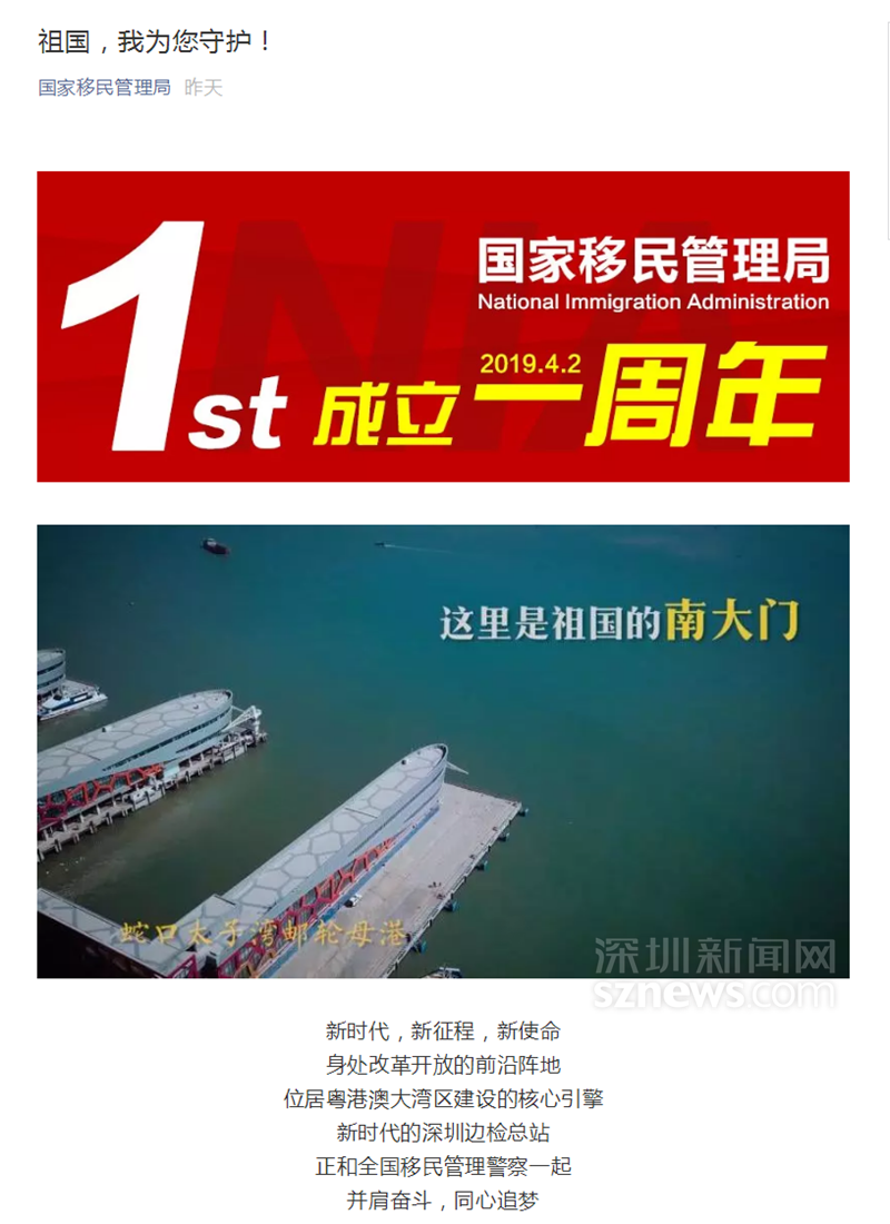 深圳新聞網(wǎng)4月4日訊(記者 張玲 通訊員 張鋮)2019年4月2日是國(guó)家移民管理局掛牌一周年,4月3日,國(guó)家移民管理局微信公眾號(hào)發(fā)布微視頻《祖國(guó),我為您守護(hù)!》。