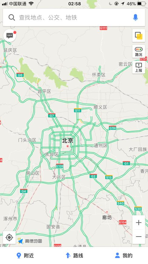 凌晨2點58分,北京周邊,高德地圖上看,一片綠色,讓人覺得特別舒服。