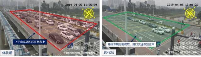 深圳交警采用遠(yuǎn)程步控及路面手動控制及時疏散積壓排隊車輛,約中午12點路面車流量逐漸減少,路口交通恢復(fù)正常。