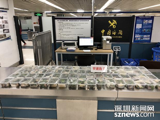 3月21日晚,兩名男性旅客各自提著兩個(gè)外形相似的大行李袋及一副魚竿,從羅湖口岸入境。在對(duì)其行李進(jìn)行X光機(jī)檢查時(shí),海關(guān)關(guān)員在機(jī)檢圖像中發(fā)現(xiàn)了異常,圖像顯示四個(gè)袋子中的物品呈現(xiàn)生物特征,而且有若干個(gè)相同的容器包裝著,于是海關(guān)關(guān)員要求兩名旅客打開行李袋進(jìn)行詳細(xì)檢查。