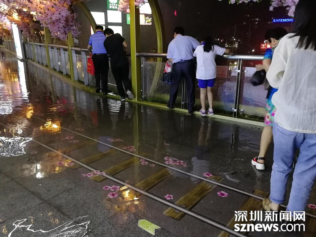深圳暴雨特效開啟,市民紛紛進入躲雨模式。(記者 邱曉潔 攝于丹竹頭地鐵站)