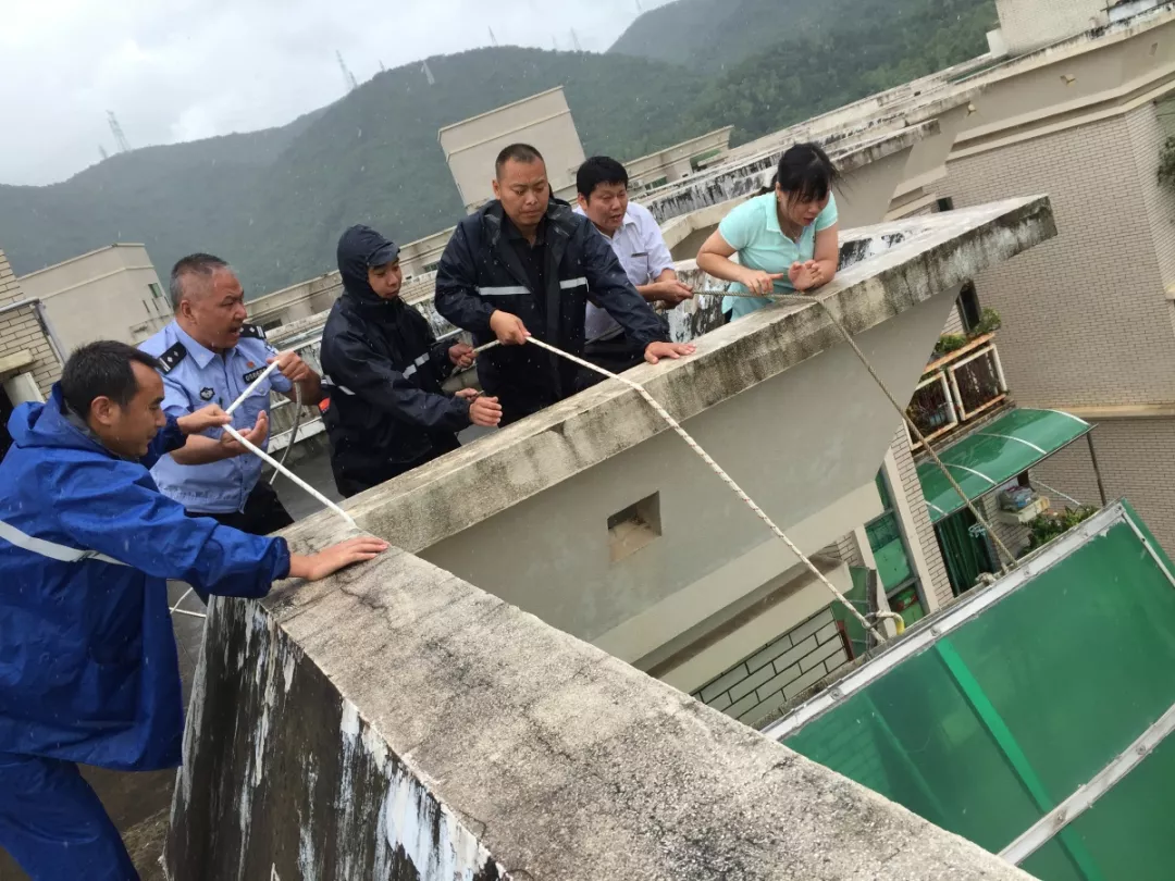 ▲2017年8月23日中午,在福田區(qū)梅林一村88棟,一家住戶的靠墻陽臺頂蓬固定支撐點已全部脫落,導(dǎo)致整個頂蓬向外傾斜,十分危險,福田公安分局梅林派出所民警聯(lián)合社區(qū)居民一起現(xiàn)場處置。