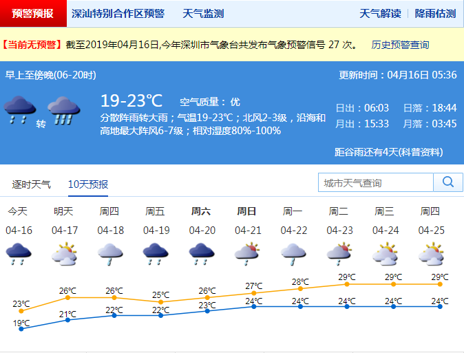 市氣象局預(yù)計17日降雨減弱,陣雨轉(zhuǎn)多云;18-20日,天氣仍不穩(wěn)定,多雷雨。21-22日,降雨趨于減弱。深圳市氣象臺2019-04-1605:36:00發(fā)布。