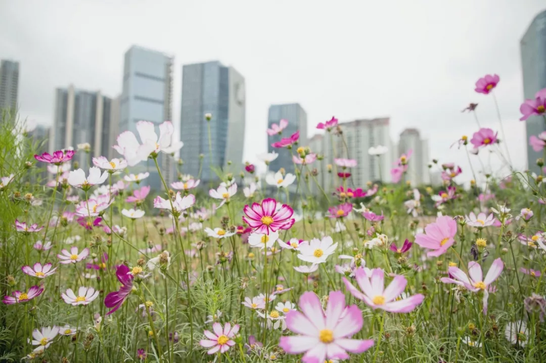 從寶安圖書(shū)館步行數(shù)十步,便是一大片浪漫的花海。風(fēng)從不遠(yuǎn)處的海面吹來(lái),那些隨風(fēng)起舞的白色、黃色、紫色、紅色、粉色的小花,就是秋英。