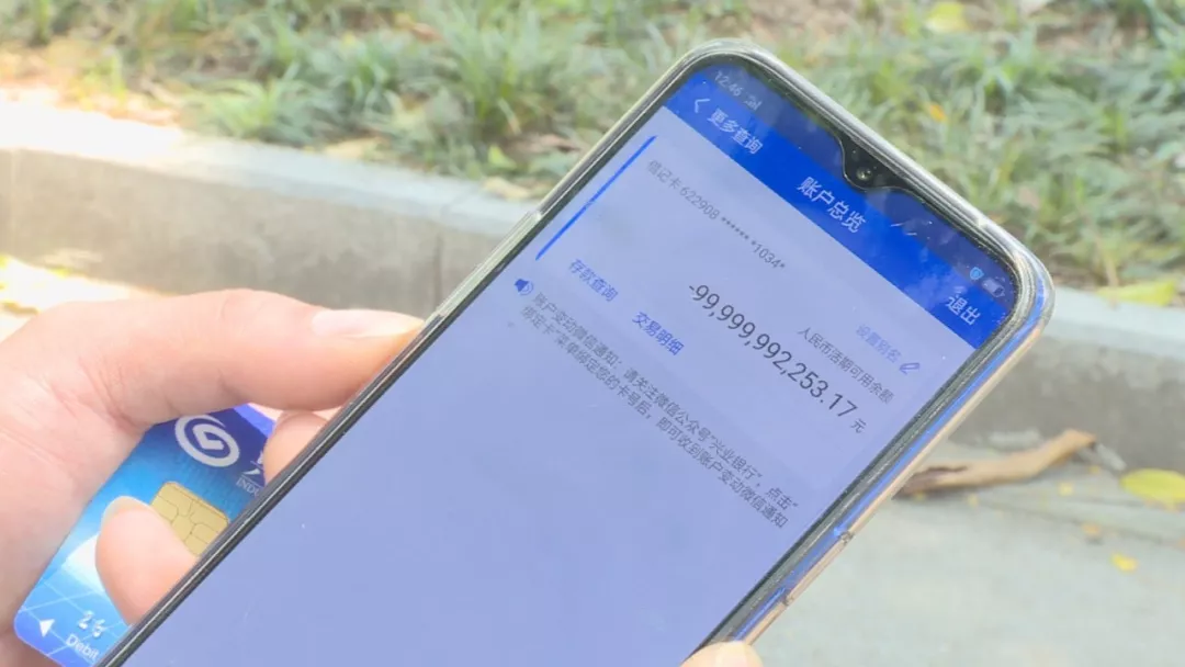 楊先生在今年2月中旬,經(jīng)朋友介紹來到深圳坪山工作,公司統(tǒng)一辦理了興業(yè)銀行的工資卡。楊先生說,第一個月發(fā)工資時,他就發(fā)現(xiàn)工資取不出來,就以為是銀行卡沒激活,沒在意??墒钱?shù)?月份的工資也用不了時,楊先生趕緊下載了手機銀行,這一查,嚇了一跳!賬戶余額顯示:-99,999,992,253.17 (負999億余元)。