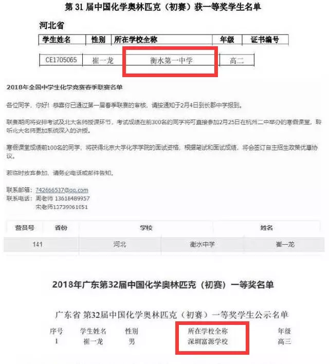 ↑ 家長提供資料顯示,圖中這位叫崔一龍的學生,于2018年代表衡水一中參加31屆奧林匹克化學獎,而再其高三的時候又代表富源中學拿了一等獎。