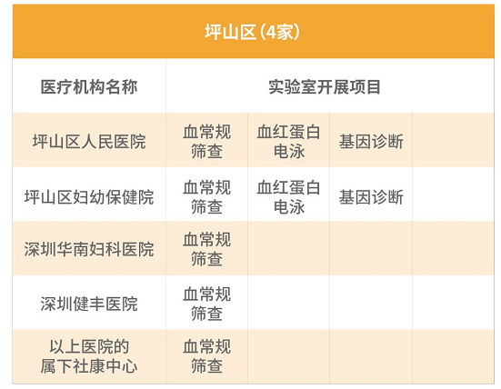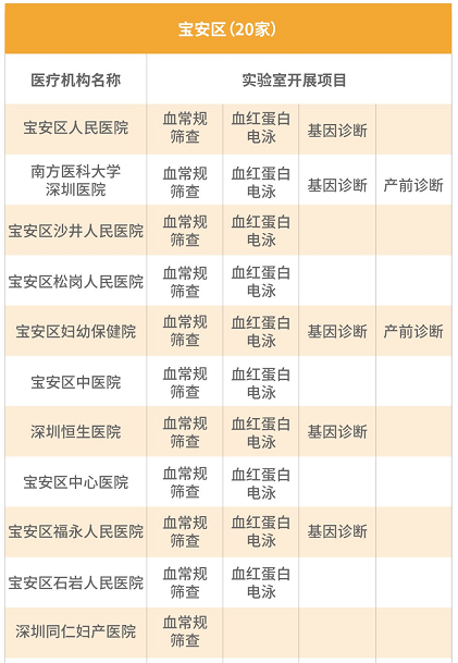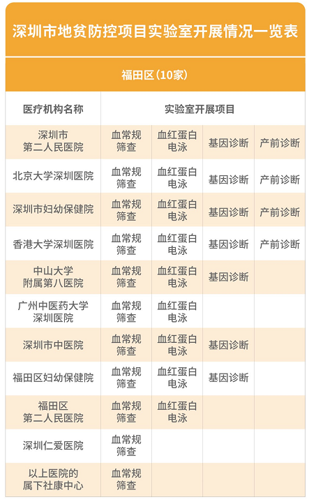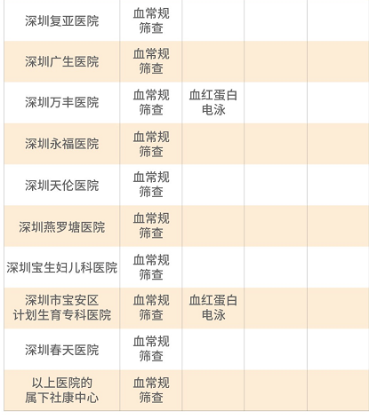 2017年起,深圳市針對常住孕婦夫婦開展免費地貧篩查項目,包括:新婚及計劃懷孕的深圳常住人口夫婦;孕前未接受地貧篩查的、夫婦雙方或一方為深圳常住人口的懷孕夫婦。