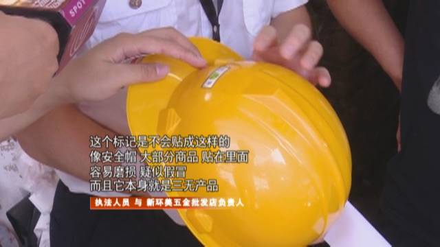 在這家“榮昌隆建材五金批發(fā)店”,擺放著多種顏色的安全帽。而執(zhí)法人員檢查發(fā)現(xiàn),其中有一款懷疑為“三無”產(chǎn)品。