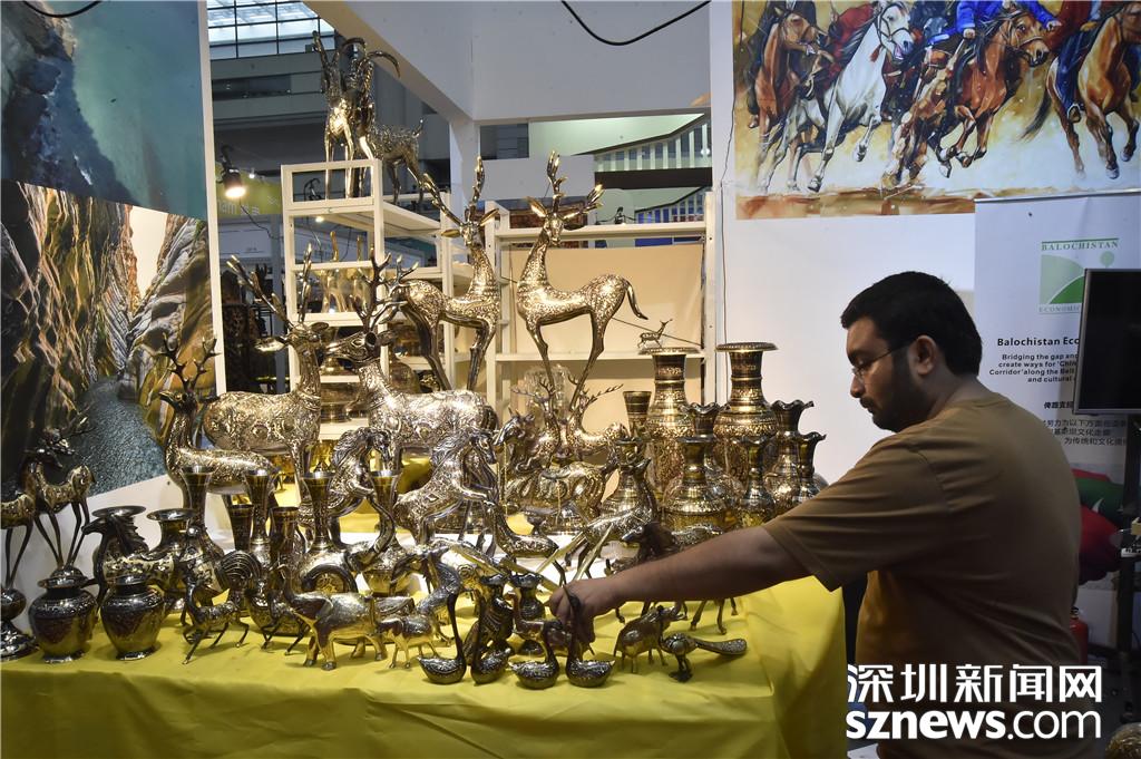 “一帶一路”館中,一位外籍商家正在整理商品