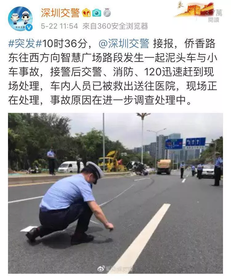 據@深圳交警官方微博消息,10時36分,僑香路東往西方向智慧廣場路段發(fā)生一起泥頭車與小車事故,接警后交警、消防、120迅速趕到現場處理,車內人員已被救出送往醫(yī)院,現場正在處理,事故原因在進一步調查處理中。