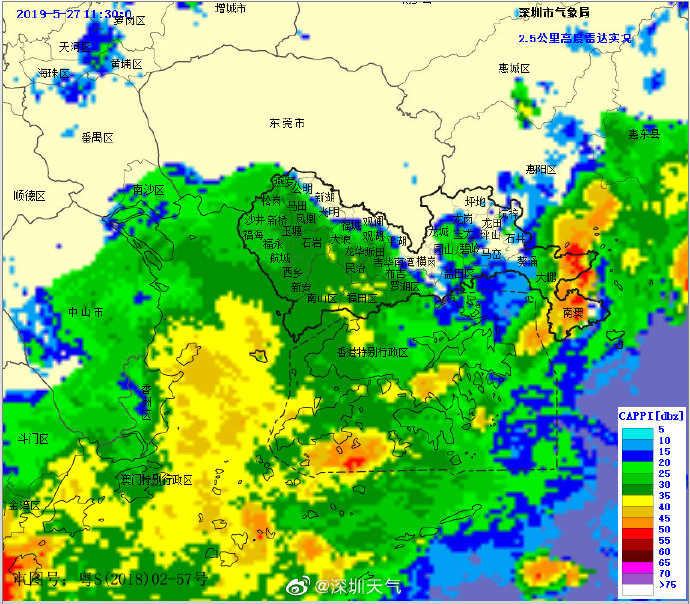 深圳市氣象臺于2019年05月27日09時15分將暴雨紅色和暴雨橙色分區(qū)預(yù)警降級為暴雨黃色預(yù)警,預(yù)計今天白天我市仍有雷雨,部分時間雨勢較大,全市暴雨黃色和雷電預(yù)警生效中,請繼續(xù)做好防御。