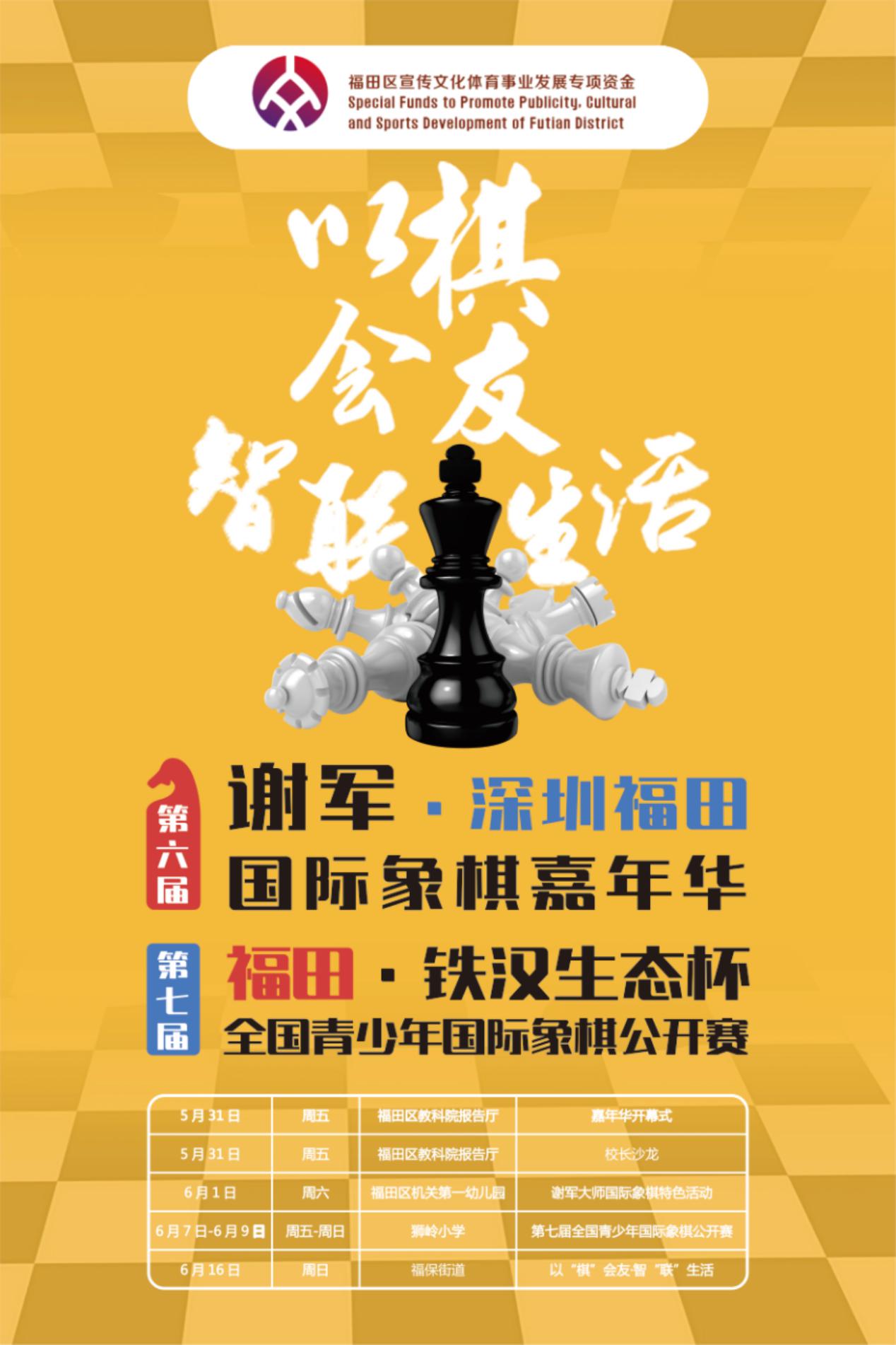 深圳新聞網(wǎng)5月29日訊 福田區(qū)一年一度的體育盛事——2019年第六屆“謝軍?深圳(福田)國(guó)際象棋嘉年華”暨第七屆“福田?鐵漢生態(tài)杯”全國(guó)青少年國(guó)際象棋公開賽即將于2019年5月31日在福田區(qū)教科院附屬小學(xué)隆重開幕。