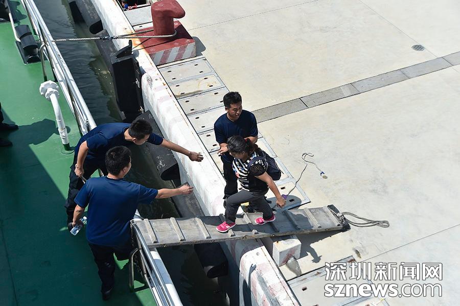 海監(jiān)船員協(xié)助本次參觀的市民上船