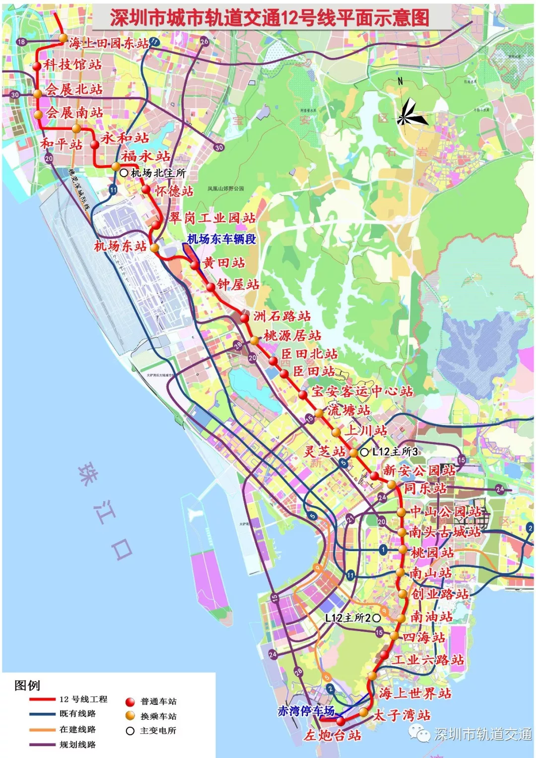 深圳地鐵12號線線路起自左炮臺站,終至海上田園東站;線路全長約40.54km,全線采用地下敷設方式;共設站33座,其中換乘站18座。