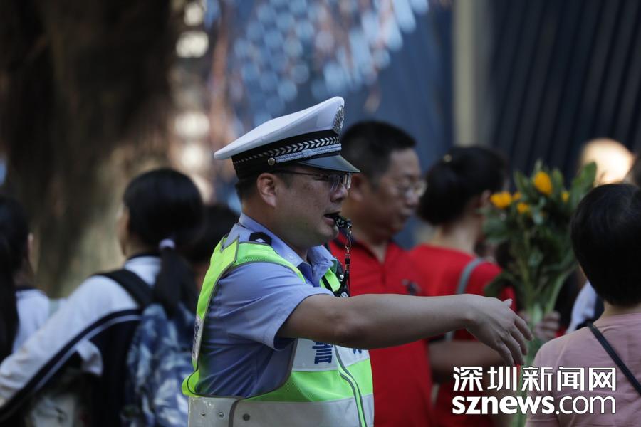 深圳實驗中學(xué)考點門口,一名交警正在指揮路面交通