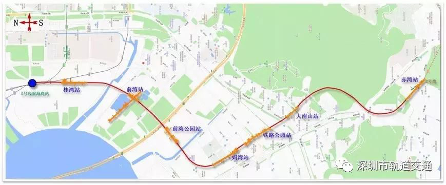 深圳地鐵5號線南延段,即5號線二期工程,北起于5號線前海灣站,經(jīng)前海、南山,終點與地鐵2號線赤灣站換乘。線路全長約7.7千米,全線采用地下敷設方式,設站7座。
