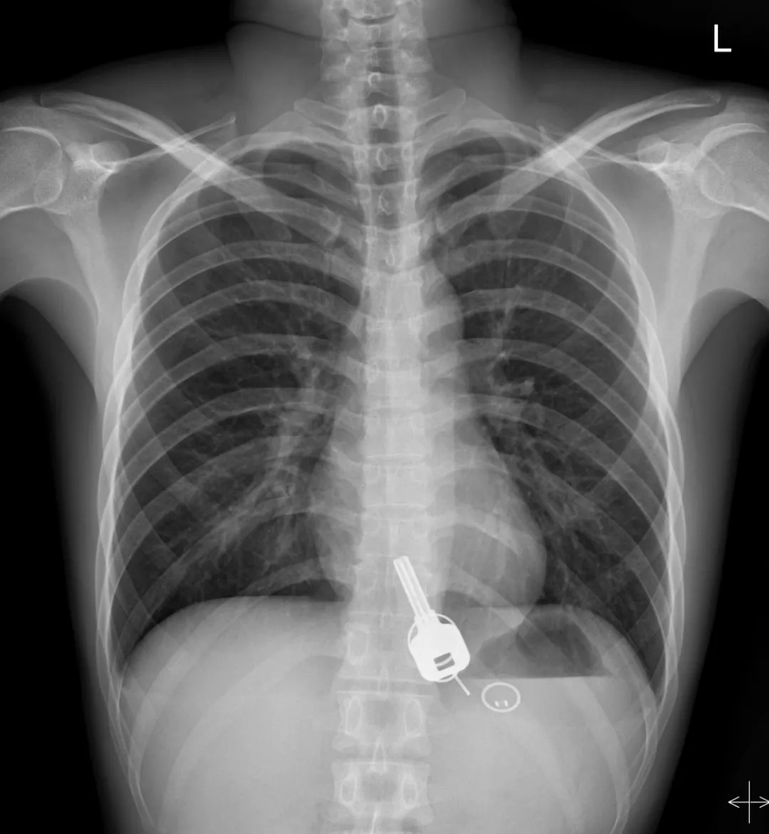 廣東東莞的常先生酒后回家找不到鑰匙,酒醒后他感到胸口疼痛,去醫(yī)院一查,發(fā)現(xiàn)一把鐵鑰匙、2個(gè)鑰匙扣、1個(gè)門(mén)禁牌清楚顯示在肚子胃區(qū)的位置上。