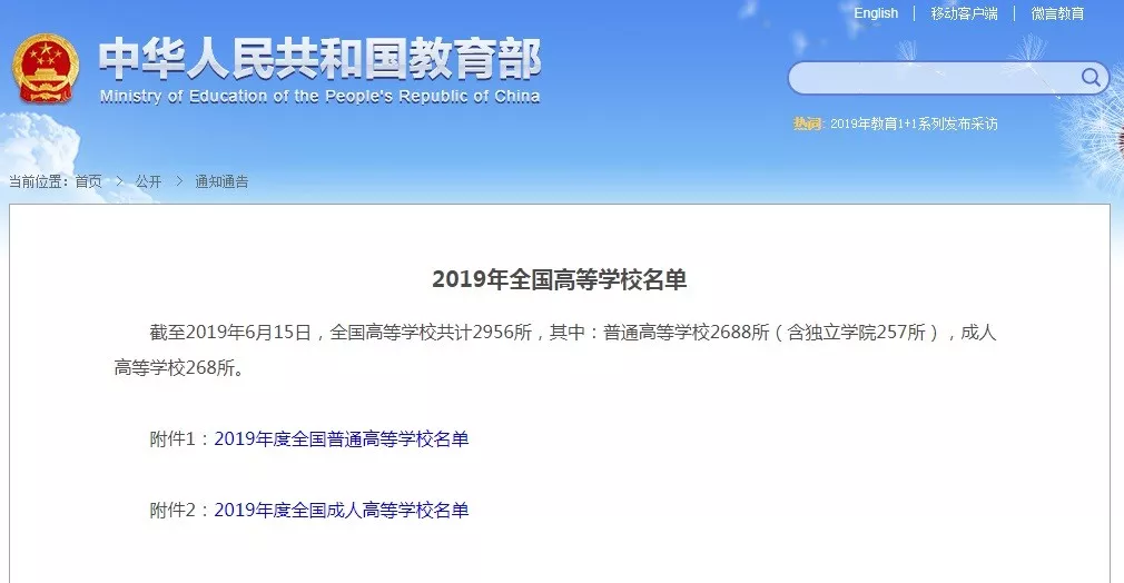近日,教育部發(fā)布了《2019年全國高等學(xué)校名單》,截至2019年6月15日,全國高等學(xué)校共計(jì)2956所,其中普通高等學(xué)校2688所(含獨(dú)立學(xué)院257所),成人高等學(xué)校268所。