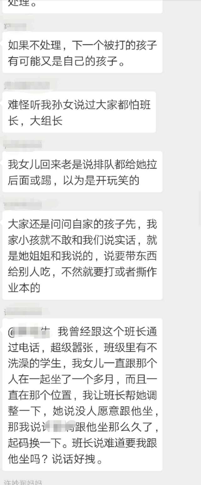 王先生把女兒的情況反映到家長(zhǎng)群里,結(jié)果群里的家長(zhǎng)紛紛表示,自己的孩子也反映當(dāng)天遭遇到班長(zhǎng)的毆打,有的孩子甚至“腿疼得難以走路”。