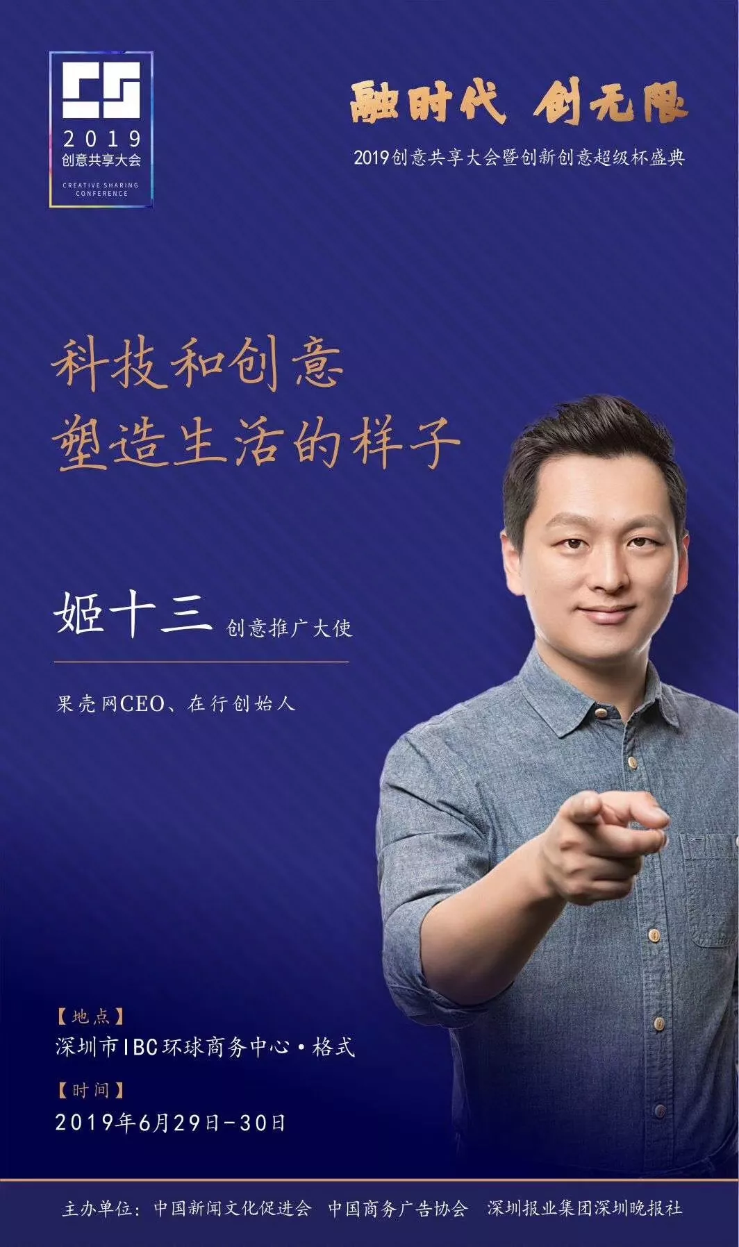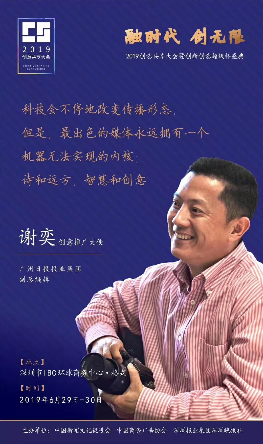 為了展現(xiàn)創(chuàng)意中國(guó)的精神風(fēng)貌和創(chuàng)意傳媒的文化力量,構(gòu)建創(chuàng)新創(chuàng)意共同體,擘畫(huà)美好圖景和未來(lái)趨勢(shì),2019年6月29日至30日,由中國(guó)新聞文化促進(jìn)會(huì)、中國(guó)商務(wù)廣告協(xié)會(huì)、深圳報(bào)業(yè)集團(tuán)深圳晚報(bào)社等聯(lián)合主辦的“融時(shí)代創(chuàng)無(wú)限——2019創(chuàng)意共享大會(huì)暨創(chuàng)新創(chuàng)意超級(jí)杯盛典”將在深圳市IBC環(huán)球商務(wù)中心隆重舉辦。